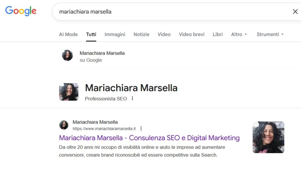 Se, ad esempio, cerchi su Google “Mariachiara Marsella“ oltre a uscire il risultato creato da Google “Professionista SEO“, trovi anche molti documenti web, non solo il mio sito web o i miei profili social, ma anche altre fonti con interviste e contributi.